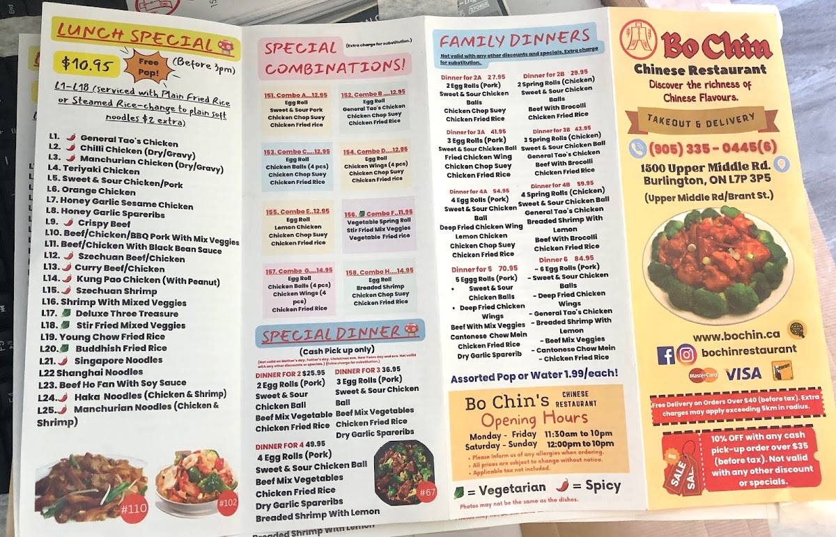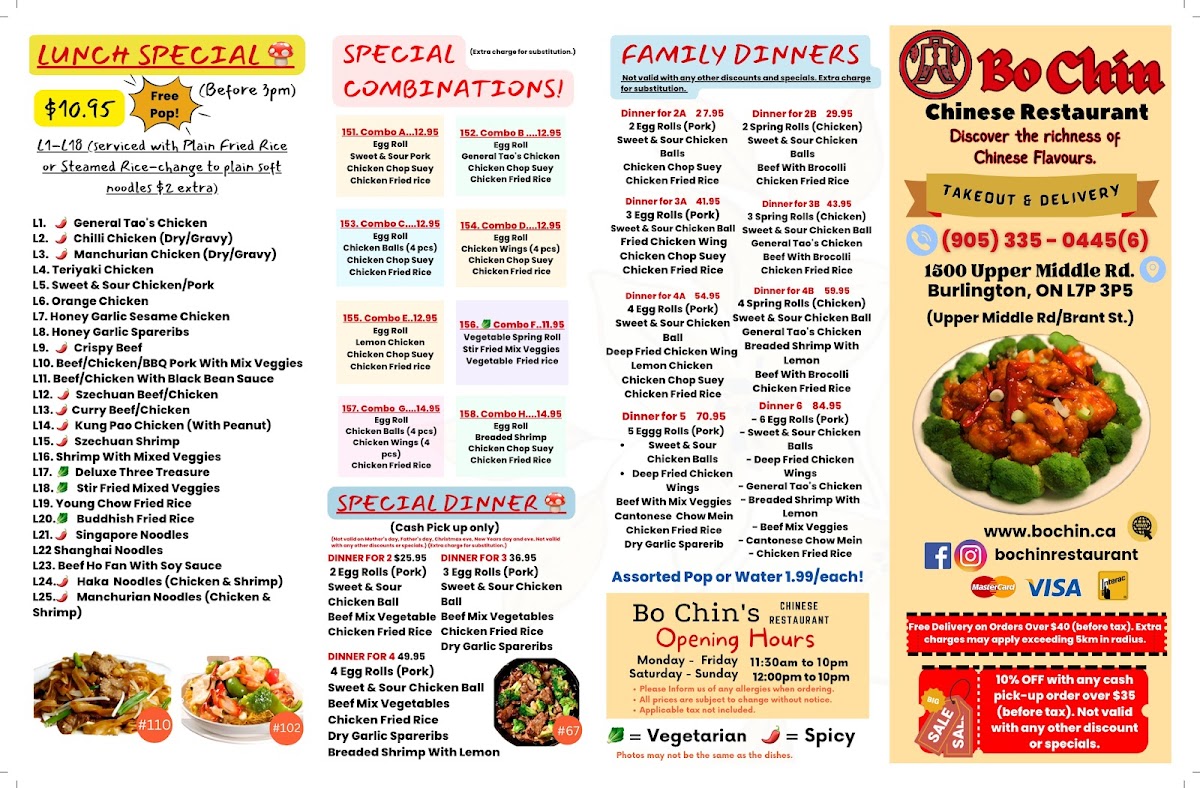 Introducing Bo Chin Chinese Food, a delightful culinary gem located at 1500 Upper Middle Rd in Burlington, ON. This charming eatery specializes in authentic Cantonese dishes, including a wide array of appetizers and vegetarian options that are sure to please everyone.