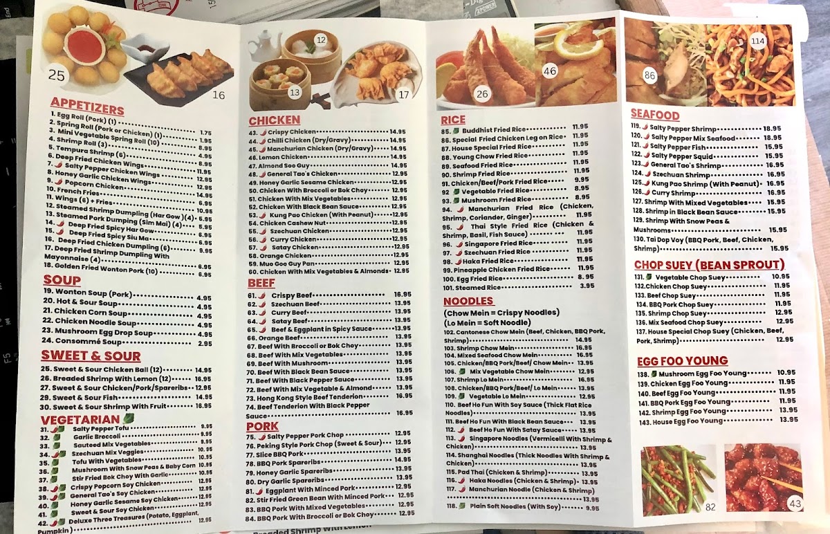 The menu features enticing appetizers like Egg Rolls and Tempura Shrimp, as well as hearty main dishes such as Spicy General Tao's Chicken and Honey Garlic Sesame Soy Chicken. Vegetarians are particularly well-catered for with flavorful choices like Salty Pepper Tofu and Stir Fried Bok Choy with Garlic.